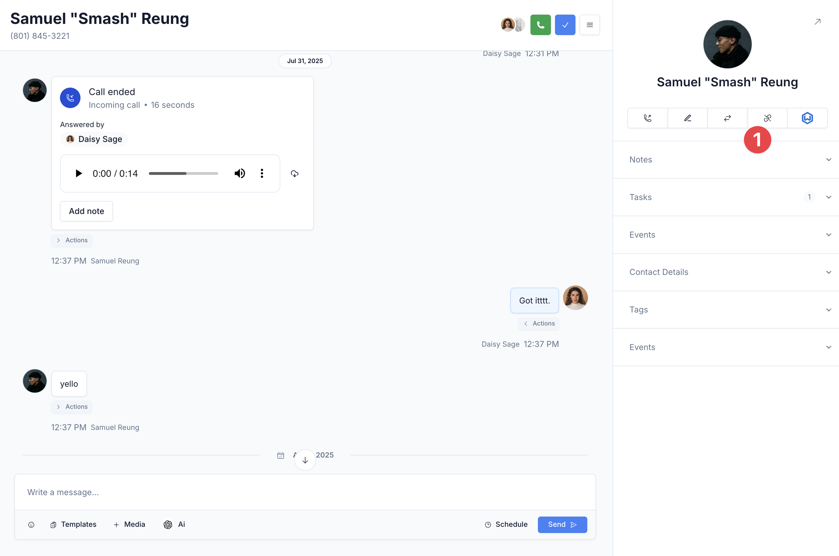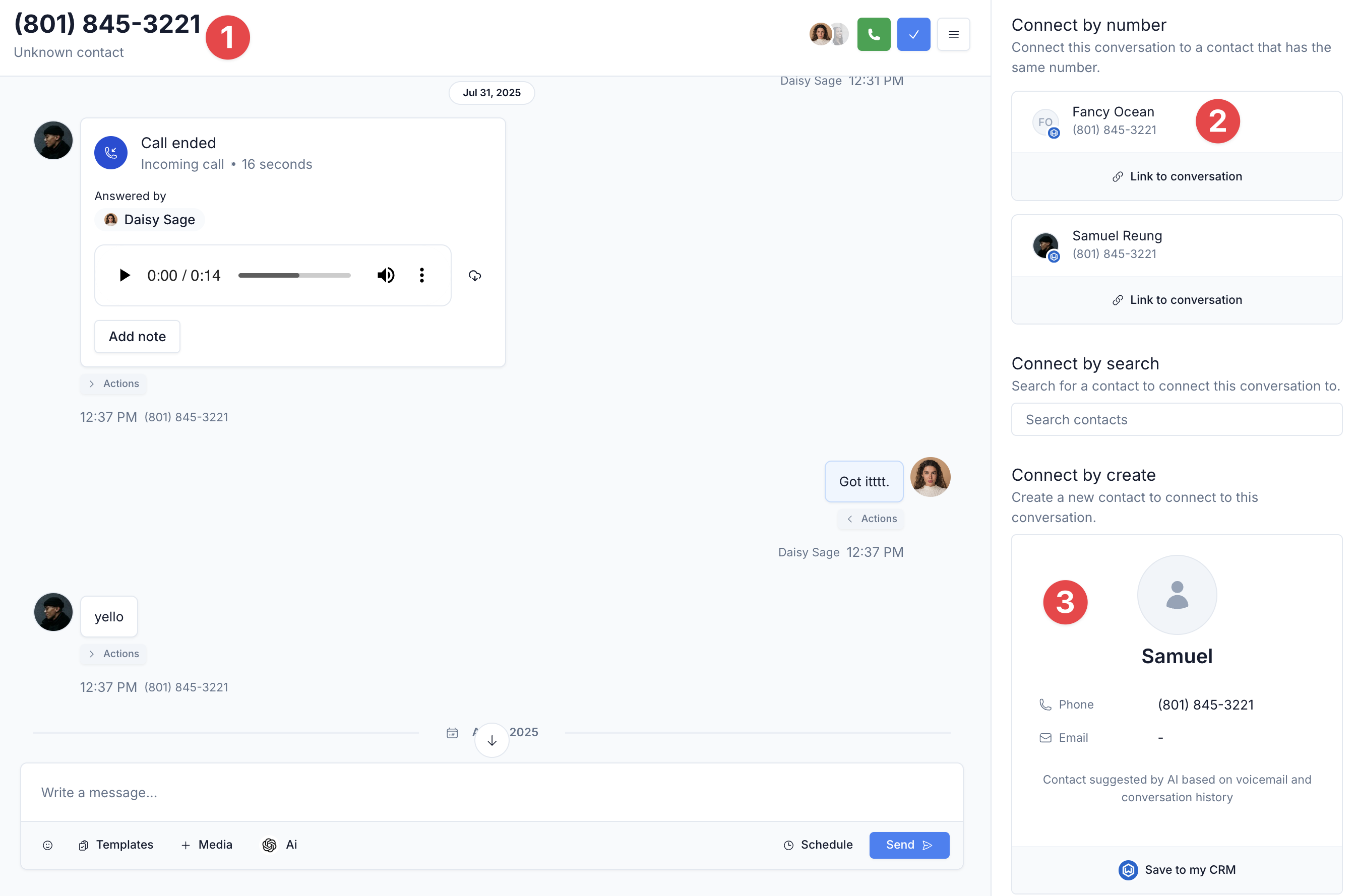 (1) Shows the number you are messaging(2) Shows contacts in your account already that have a matching phone number(3) Gives you an option to create a new contactFrom here, you can choose to attach to an existing contact or create a new one. That will link the conversation to the client and from this point on, any messages in this conversation will be synced to your CRM.